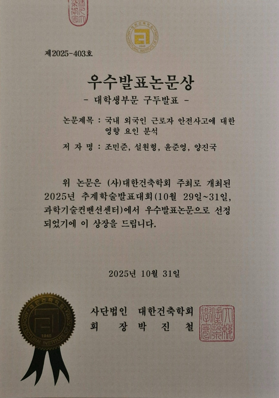 수상 논문은‘국내 외국인 근로자 안전사고에 대한 영향 요인 분석’이다. 이 논문은 최근 증가하고 있는 건설현장 외국인 근로자들의 안전사고 발생에 대한 영향 요인을 체계적으로 분석한 내용으로 외국인 근로자들의 안전사고 예방 기준을 수립을 하는데 도움을 줄 것으로 평가받았다.