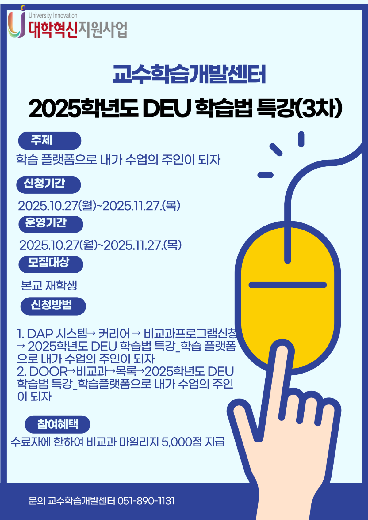 교수학습개발센터의 학습지원 프로그램인 2025학년도 DEU 학습법 특강(3차)을 다음과 같이 안내하오니 많은 신청 바랍니다.